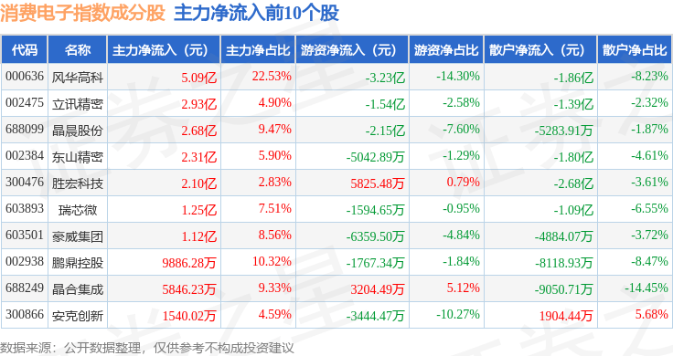 资金流向方面,消费电子(980030)指数成份股当日主力资金净流出合计18.83亿元,游资资金净流入合计1.59亿元,散户资金净流入合计17.24亿元。成份股资金流向详情见下表: