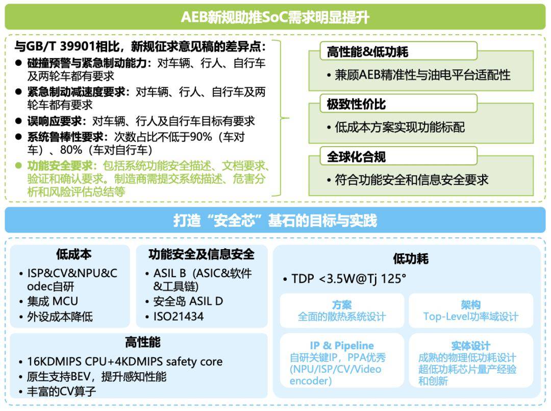 爱芯元智车载产品线市场与生态部市场总监黄熙指出,AEB强制性标准将于2028年1月1日实施,在AEB新规的助推下,高性能低功耗(兼顾AEB精准性与油电平台适配性)、极致性价比(低成本方案实现功能标配 )及全球化合规(符合功能安全和信息安全要求)正成为SoC的关键需求。为此,需从自研ISP/CV等模块、集成MCU、丰富CV算子、散热与架构优化等多维度发力,以适配新规需求。