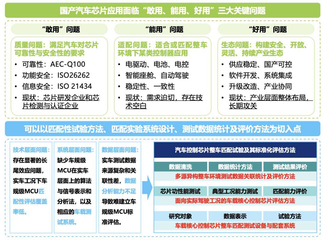 清华大学计算机科学与技术系长聘教授李兆麟在三十二届中国汽车工程学会年会暨展览会车规级芯片设计、应用和检测——前沿和趋势论坛中提出:“我国汽车芯片市场规模全球领先,但自主品牌市场占有率不高,与欧美日韩等汽车芯片企业存在明显差距。当前,国产汽车芯片应用面临‘敢用、能用、好用’等问题,问题核心是自主研制车规级MCU芯片是否匹配实际车辆在实际工况下的功能、性能、稳定性、一致性等方面的技术要求,及如何判定实际效果。”