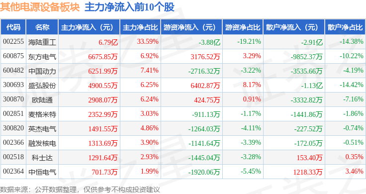 从资金流向上来看,当日其他电源设备板块主力资金净流入2.06亿元,游资资金净流出1.16亿元,散户资金净流出8989.66万元。其他电源设备板块个股资金流向见下表: