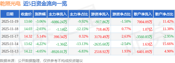 证券之星消息,截至2025年11月19日收盘,乾照光电(300102)报收于13.6元,下跌3.06%,换手率4.88%,成交量44.68万手,成交额6.13亿元。