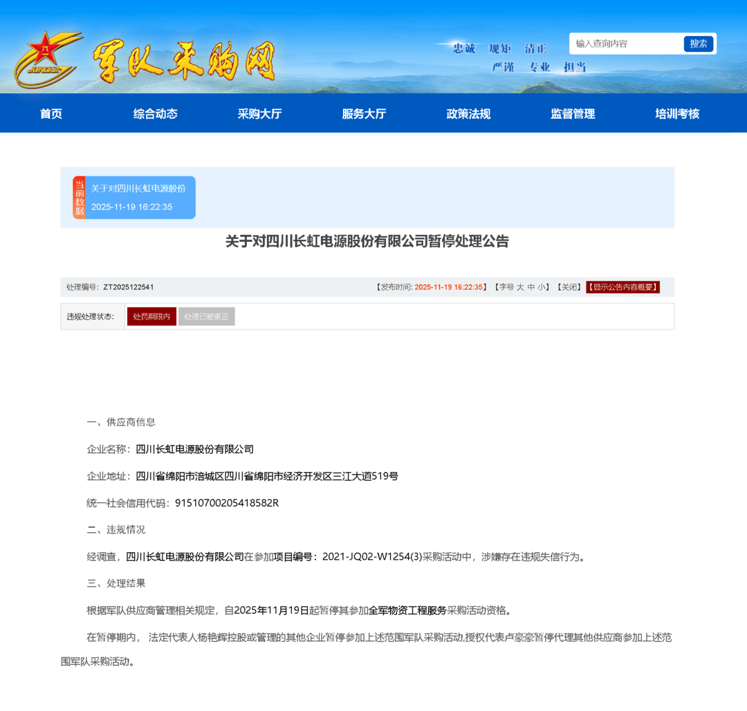 近日,军队采购网发布关于对四川长虹电源股份有限公司暂停处理公告。公告概要显示暂停事由为履约不当。