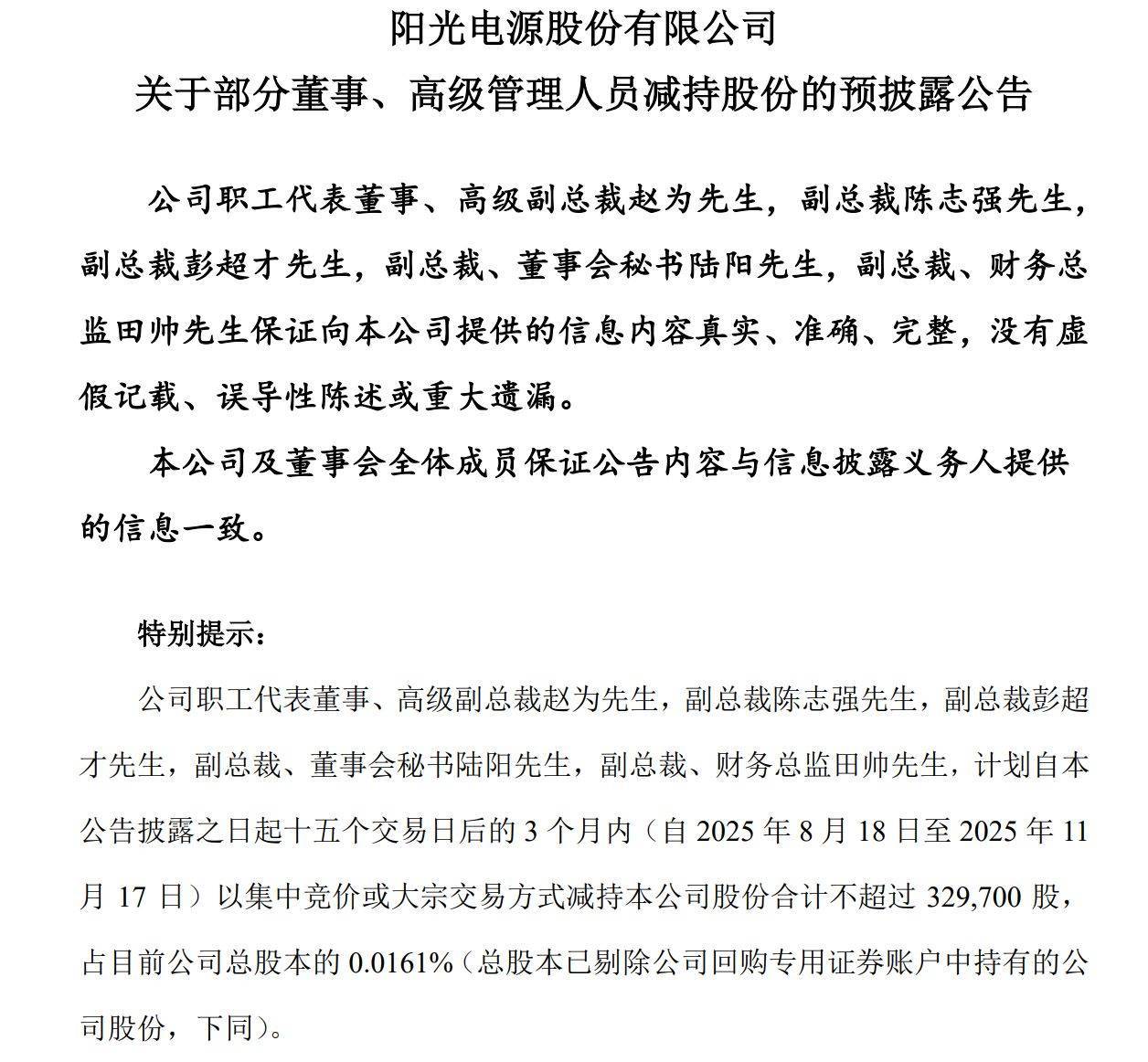 根据阳光电源7月25日公告,公司职工代表董事、高级副总裁赵为,副总裁陈志强,副总裁彭超才,副总裁、董事会秘书陆阳,副总裁、财务总监田帅计划于2025年8月18日至2025年11月17日以集中竞价或大宗交易方式分别减持公司股份不超过150000股、131200股、27500股、10500股、10500股,合计不超过32.97万股,占公司总股本的0.0161%。