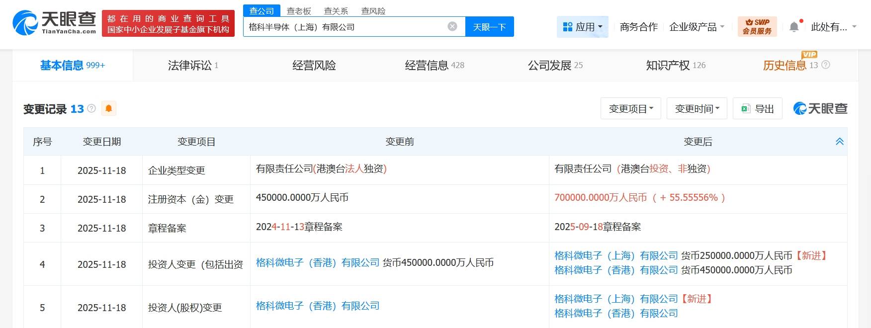 天眼查工商信息显示,近日,格科半导体(上海)有限公司发生工商变更,新增格科微电子(上海)有限公司为股东,同时,注册资本由45亿人民币增至70亿人民币,增幅约56%。