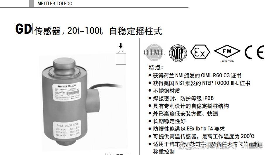 【广州兰瑟★电子-杨工】专业提供托利多GD-50T传感器,20t~100t 自稳定摇柱式详细信息,包括称重传感器价格,传感器图片,技术参数,请进入【广州兰瑟电子科技有限公司】网站了解查找相关型号。托利多GD传感器,20t~100t 自稳定摇柱式,托利多GD系列传感器,作为高精度称重领域的标杆产品,以其卓越的稳定性和可靠性著称。该系列涵盖20吨至100吨的宽泛量程,采用先进的摇柱式结构设计,不仅具备出色的抗偏载能力,还能在复杂工况下保持长期稳定性,犹如工业称重系统中的"定海神针"。