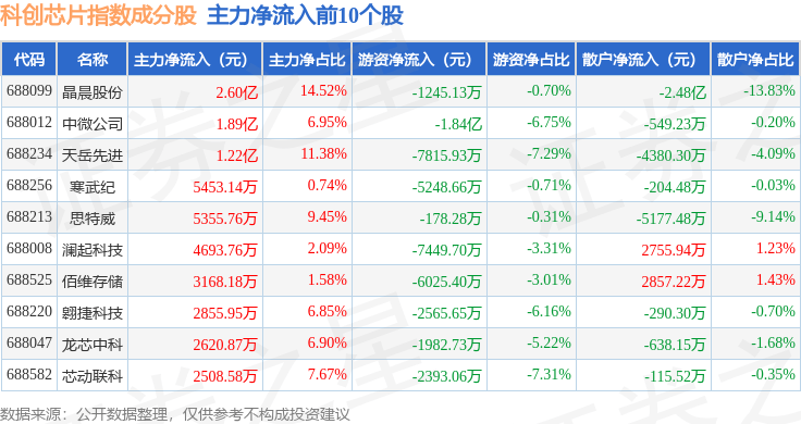 资金流向方面,科创芯片(000685)指数成份股当日主力资金净流出合计9.01亿元,游资资金净流出合计1.72亿元,散户资金净流入合计10.74亿元。成份股资金流向详情见下表: