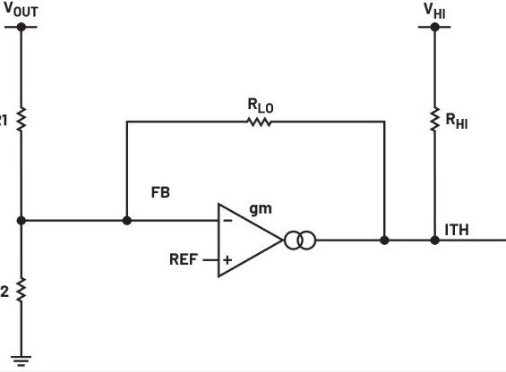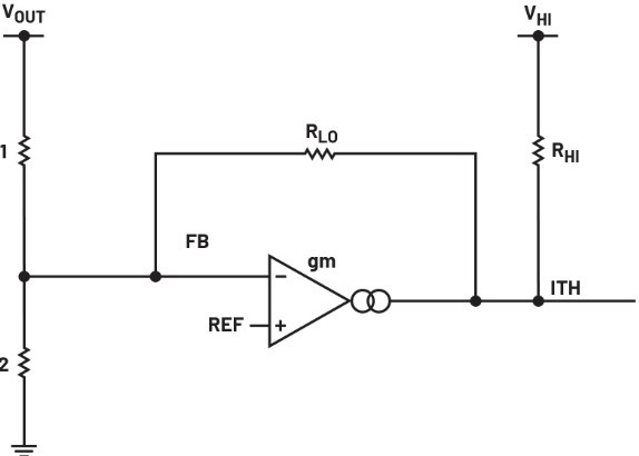 图2展示了串联AVP补偿电路的具体结构。其内部基准电压与输出反馈电压分别连接至误差放大器的正输入端与负输入端。通过电阻RHI引入的电压用于向放大器输出端提供适当的直流偏置,以避免其进入饱和状态。位于放大器输出与反馈节点之间的电阻RLO用于设定放大器的增益。需要注意的是,RHI与RLO的阻值应远大于分压电阻R1和R2。