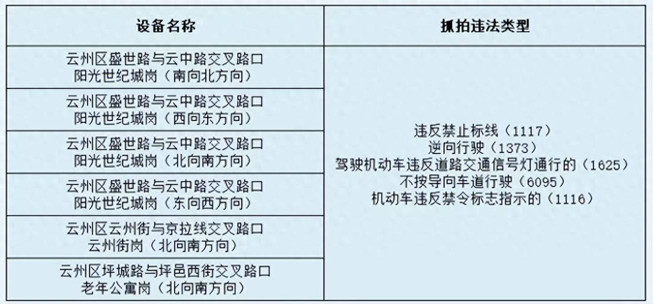 为进一步加强道路交通安全管理,有效预防和减少道路交通事故发生,根据《中华人民共和国道路交通安全法》及其实施条例以及公安部《道路交通安全违法行为处理程序规定》等法律法规有关规定,并结合道路实际状况,现决定启用大同市云州区辖区的6处电子警察抓拍设备,将对机动车闯红灯、压线、不按导向车道行驶、逆行等违法行为进行抓拍取证并依法实施处罚。