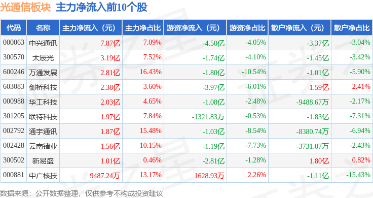 从资金流向上来看,当日光通信板块主力资金净流出26.81亿元,游资资金净流入6.04亿元,散户资金净流入20.77亿元。光通信板块个股资金流向见下表: