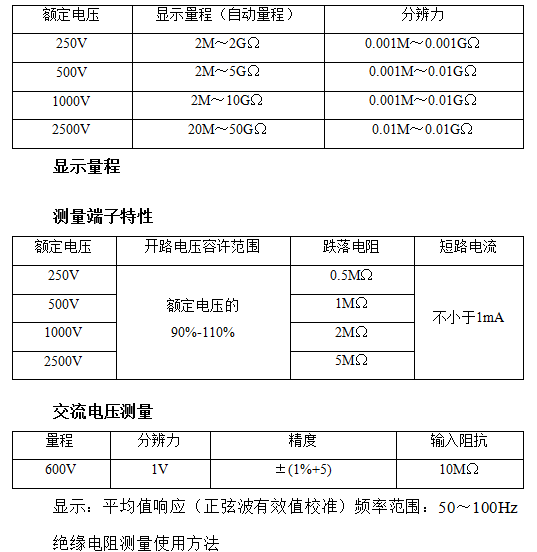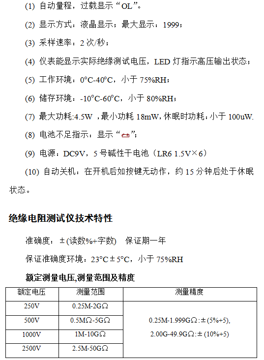 根据不同机型,输出测试电压250V/500V/1000V/2500V可切换。普通绝缘电阻测试仪不能测量自身输出的高压,在绝缘电阻测试仪输出高压不符合额定值时,用户不容易发现,以至有时测量结果偏差过大,造成安全隐患,它可适时监测输出高压,用户在任何时候都能观察到仪表实际输出的测量电压,有效避免因输出电压不符合额定值要求而造成的误判。仪表测量范围最高可达到50GΩ,可根据需要设置测量时间,测量完毕后或在测量中按任一按键都会自动保持测量结果。