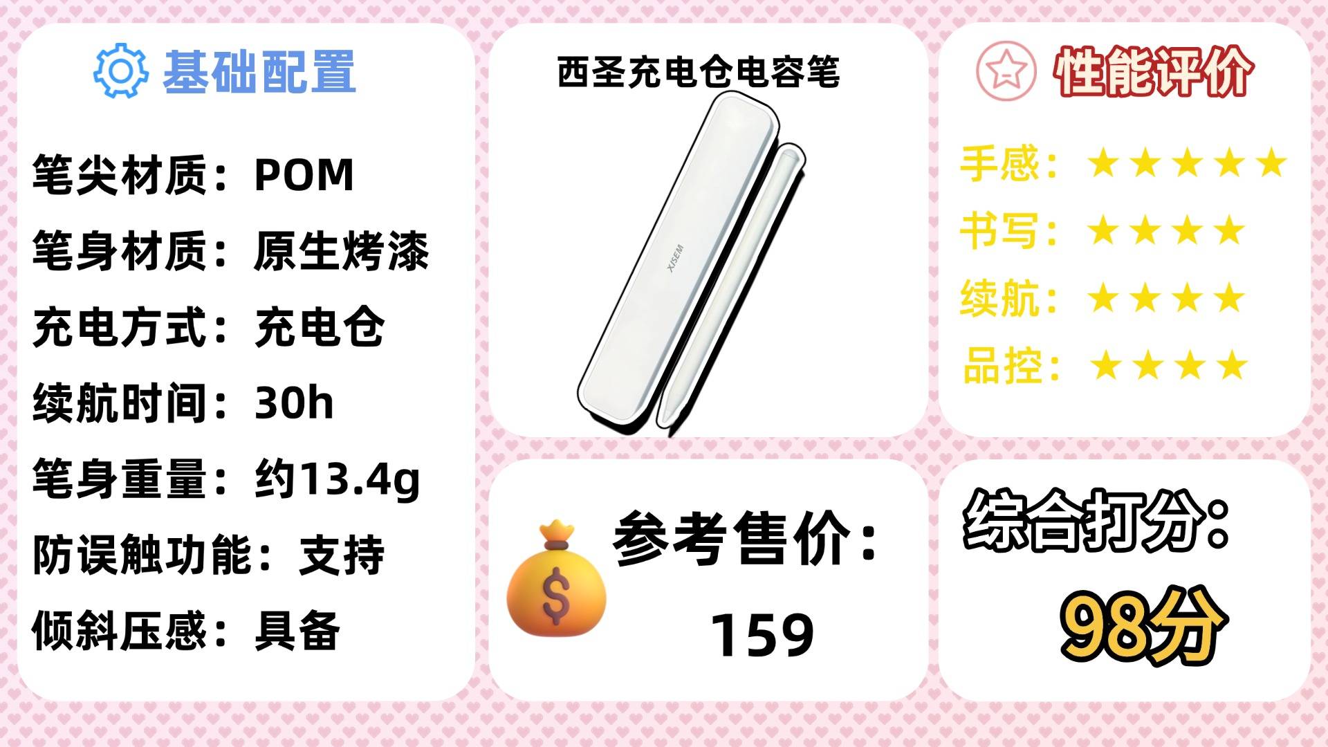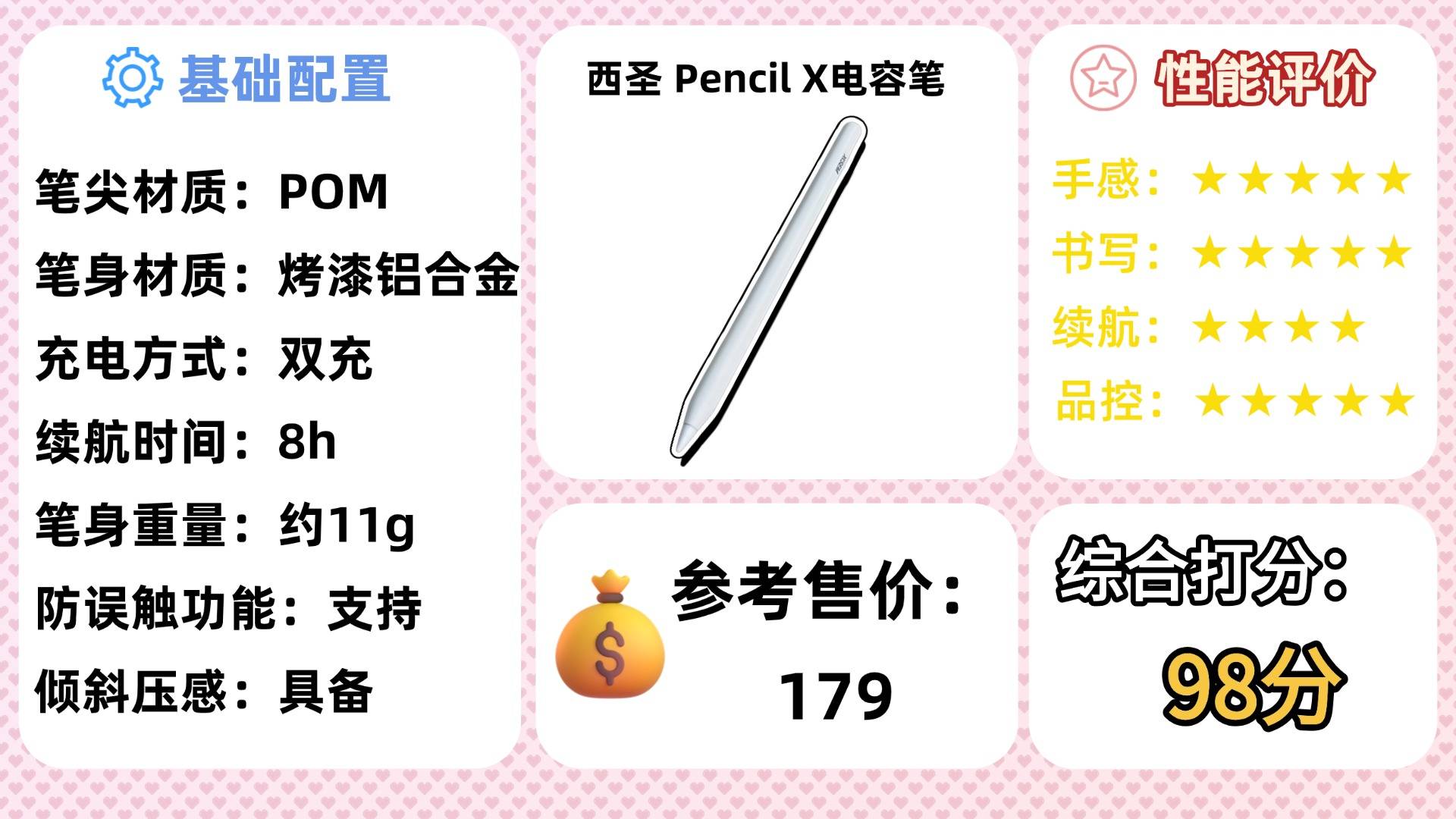 总体来说,西圣Pencil X凭借其超高的性价比、高流畅度的书写体验、出色的性能稳定性以及超长续航,完全不输Apple Pencil,成为了平替电容笔中的佼佼者,是那些追求高效创作和精确书写的用户的理想选择。