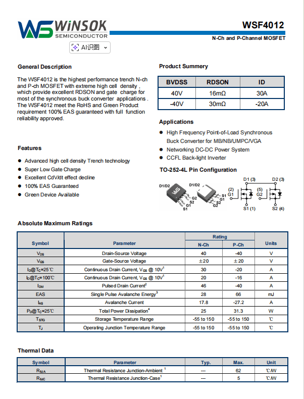N+P双通道集成:单TO-252-4L封装集成N沟道(40V/30A/16mΩ)与P沟道(-40V/-20A/30mΩ),可构建全桥驱动电路,节省60%PCB面积,适配后视镜小型化趋势。
