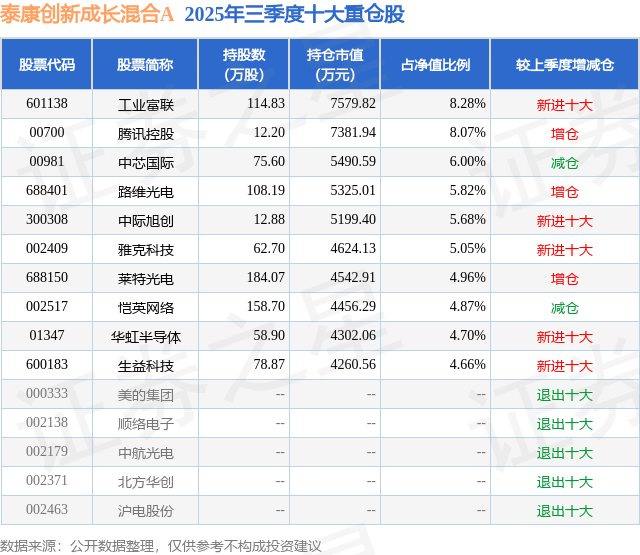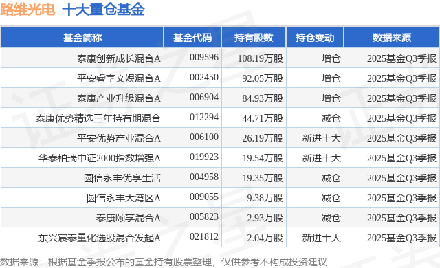 根据2025基金Q3季报公募基金重仓股数据,重仓该股的公募基金共11家,其中持有数量最多的公募基金为泰康基金的泰康创新成长混合A。泰康创新成长混合A目前规模为8.12亿元,最新净值1.242(11月27日),较上一交易日下跌0.45%,近一年上涨39.75%。该公募基金现任基金经理为薛小波。薛小波在任的基金产品包括:泰康产业升级混合A,管理时间为2019年5月17日至今,期间收益率为157.66%;泰康优势精选三年持有期混合,管理时间为2021年8月31日至今,期间收益率为10.87%。