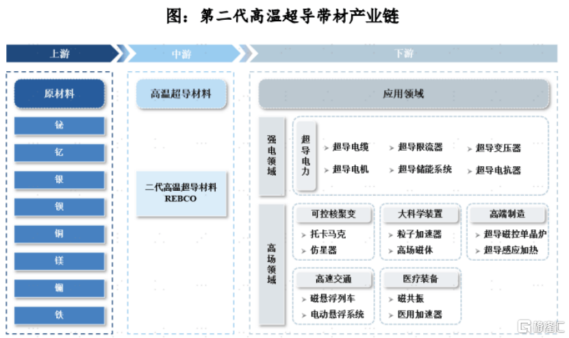 下游应用领域主要集中在两个方向:一方面,在强电方向,其可用于增强载流量,减轻电工装备的重量、减小体积、减少占地面积以及提升能效等,主要用于电力领域,如超导电缆、超导限流器、超导电机(调相机)、超导储能系统等;另一方面,在高场方向,利用其大电流产生的大磁场,可广泛服务于可控核聚变、大科学装置、高端制造、医疗装备等领域。
