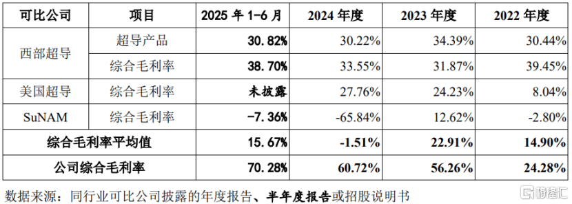 报告期内,上海超导的综合毛利率分别为24.28%、56.26%、60.72%、70.28%,呈上升趋势,且高于同行业上市公司(西部超导、美国超导、SuNAM)均值。公司在第二代高温超导带材领域具备较大的先发优势,国内竞争对手相对较少,具备较强的技术优势和议价能力。