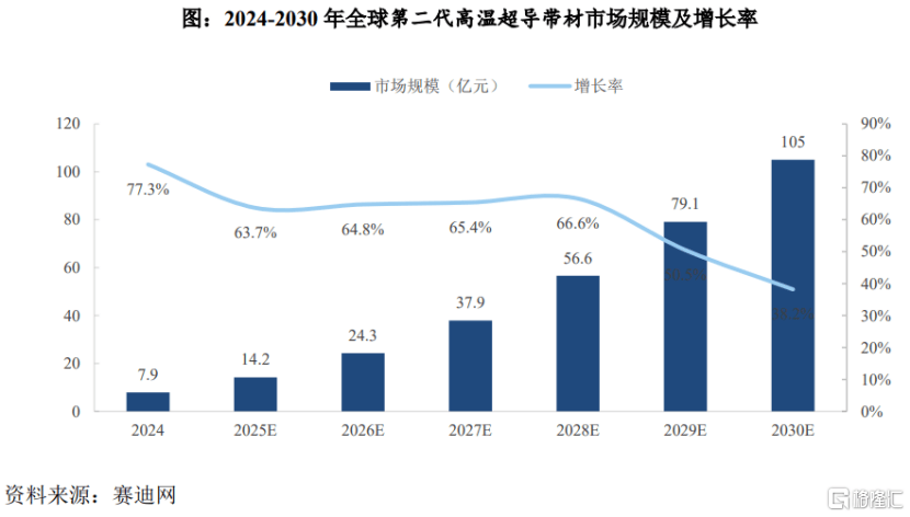 市场规模方面,据赛迪数据,2024年全球第二代高温超导带材市场规模为7.9亿元,同比增长77.3%,预计到2030年市场规模将达到105亿元,2024年至2030年间的复合增长率为53.9%。