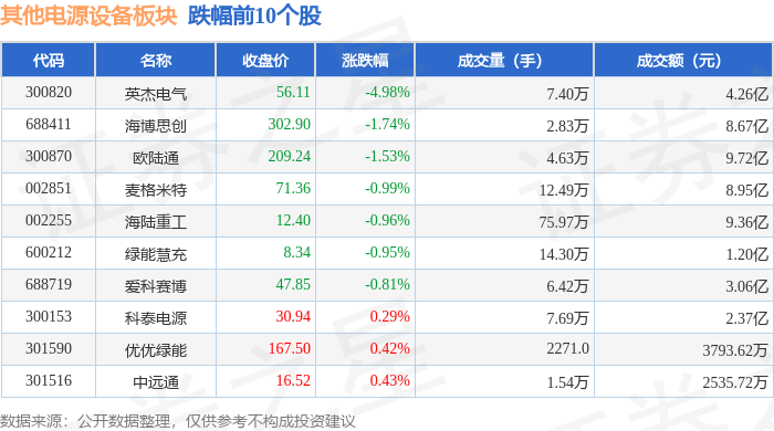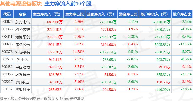 从资金流向上来看,当日其他电源设备板块主力资金净流出1.92亿元,游资资金净流出8606.42万元,散户资金净流入2.78亿元。其他电源设备板块个股资金流向见下表: