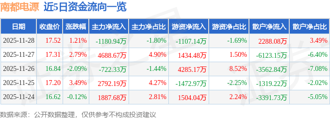 证券之星消息,截至2025年11月28日收盘,南都电源(300068)报收于17.52元,上涨1.21%,换手率4.4%,成交量37.5万手,成交额6.56亿元。
