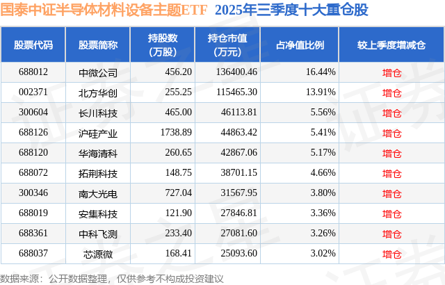 国泰中证半导体材料设备主题ETF的前十大重仓股如下: