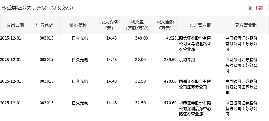 12月1日,日久光电大宗交易成交425万股,成交额6154万元,占当日总成交额的31.43%,成交价14.48元,较市场收盘价16.35元折价11.44%。