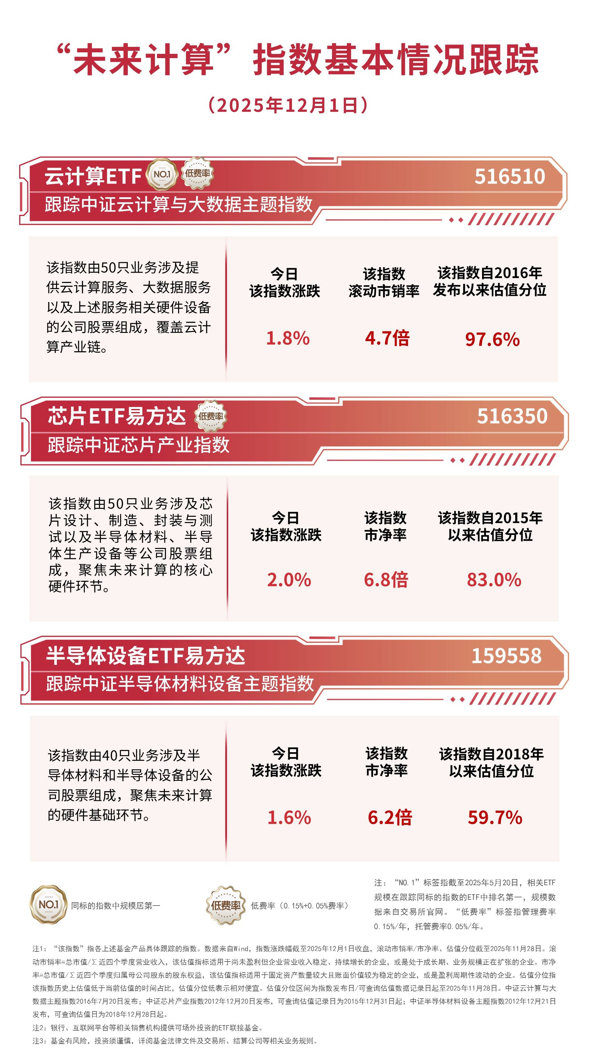 今日,半导体芯片板块全线走强,北京君正20%涨停,华润微涨超9%,华海诚科、晶瑞电材涨超7%。指数层面,中证芯片产业指数上涨2.0%,中证云计算与大数据主题指数上涨1.8%,中证半导体材料设备主题指数上涨1.6%。