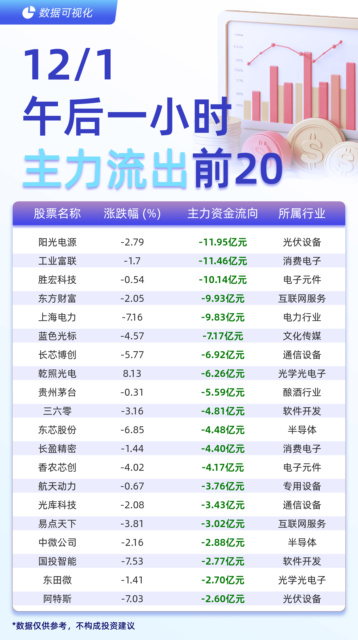 据交易所数据显示,截至12月1日午后一小时,主力资金流出前20的股票分别为: 阳光电源(-11.95亿元)、 工业富联(-11.46亿元)、 胜宏科技(-10.14亿元)、 东方财富(-9.93亿元)、 上海电力(-9.83亿元)、 蓝色光标(-7.17亿元)、 长芯博创(-6.92亿元)、 乾照光电(-6.26亿元)、 贵州茅台(-5.59亿元)、 三六零(-4.81亿元)、 东芯股份(-4.48亿元)、 长盈精密(-4.40亿元)、 香农芯创(-4.17亿元)、 航天动力(-3.76亿元)、 光库科技(-3.43亿元)、 易点天下(-3.02亿元)、 中微公司(-2.88亿元)、 国投智能(-2.77亿元)、 东田微(-2.70亿元)、 阿特斯(-2.60亿元)。
