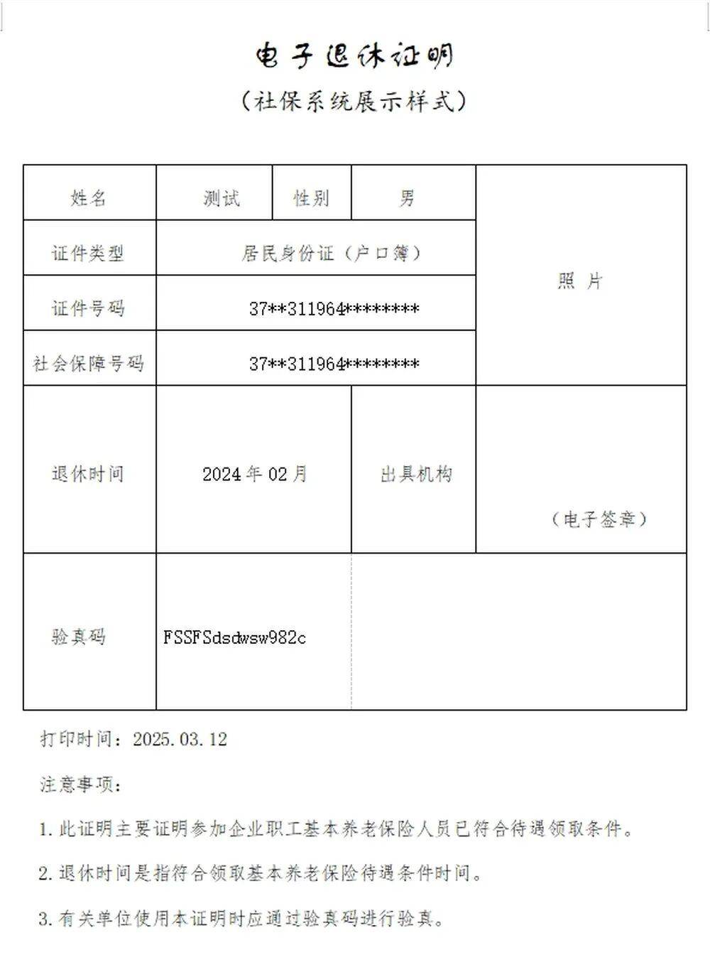 (一)电子退休证明“爱山东”APP展示样式(见附件1),底板以第三代社会保障卡的水波纹为基础,增加SDHRSS底纹。标题“电子退休证明”为华文中宋,正文信息栏、注释信息栏为宋体。照片调取自社会保障卡照片。正文信息包括姓名、性别、身份证号码、退休时间(精确到年月),加盖“山东省人力资源和社会保障厅离退休专用章”,注释包括“此证明主要证明参加企业职工基本养老保险人员已符合待遇领取条件”“退休时间是指符合领取基本养老保险待遇条件时间”和“查询时间”内容。