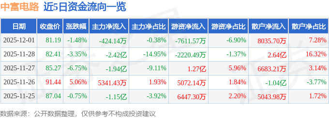 证券之星消息,截至2025年12月1日收盘,中富电路(300814)报收于81.19元,下跌1.48%,换手率7.08%,成交量13.56万手,成交额11.03亿元。