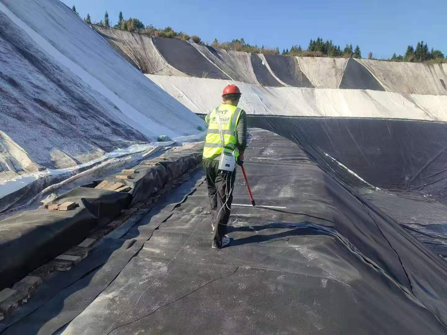 高密度电阻率法主要用于填埋场运营期或封场后,对有土层或垃圾覆盖的土工膜进行渗漏破损探测。其原理是利用土工膜(绝缘)与周围覆盖材料(导电)的电性差异。当膜完好时,电流分布稳定;一旦破损,渗滤液形成导电通道,会导致地表测量到的电阻率出现局部低值异常。