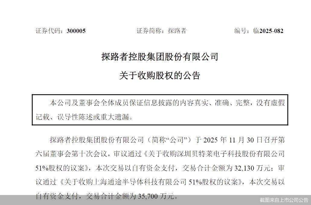 消息面上,12月1日晚间,探路者披露了一则收购股权公告,拟以自有资金3.21亿元收购贝特莱51%的股份,并拟以自有资金3.57亿元收购上海通途51%的股权,意在进一步加码公司芯片产业布局。