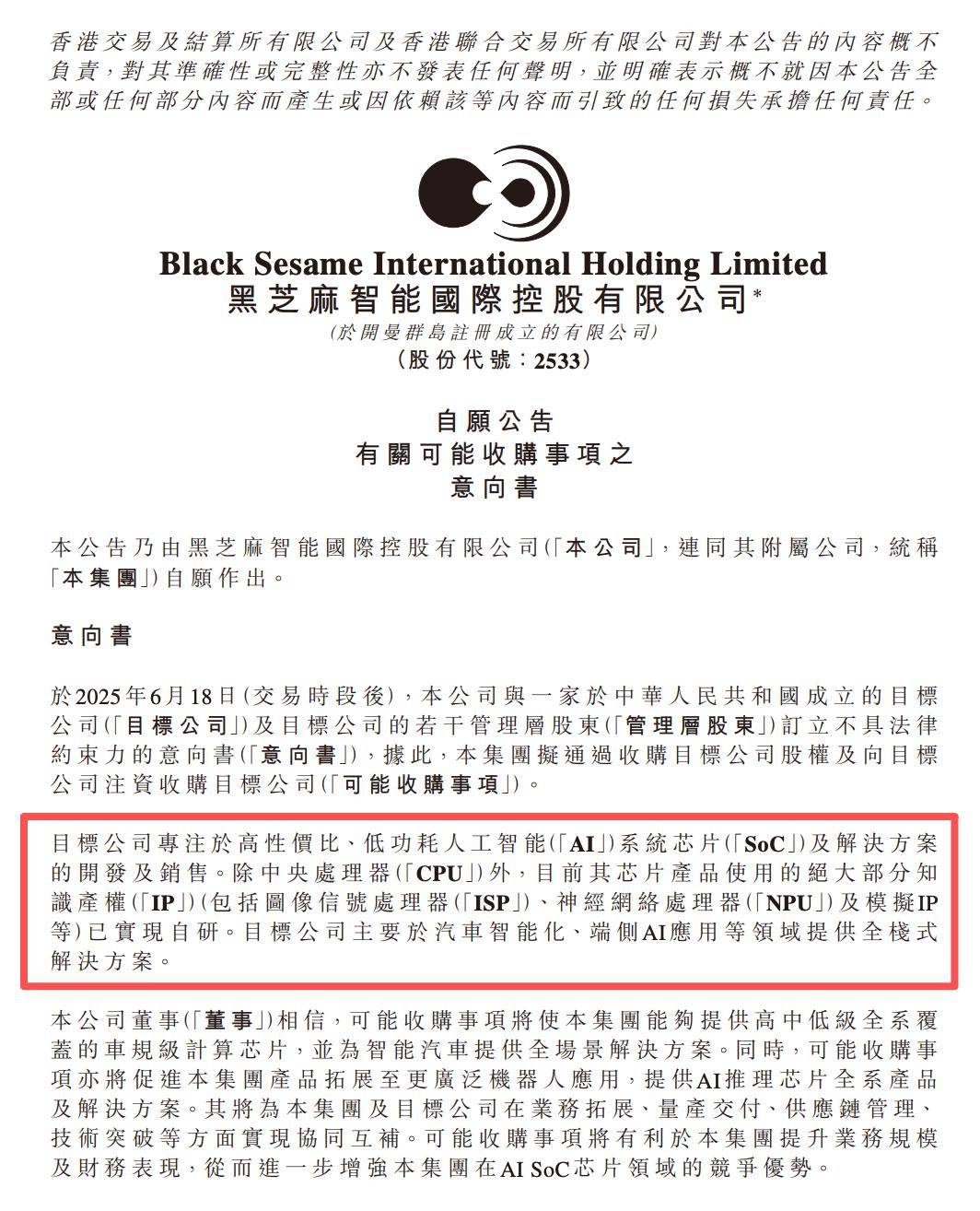 今年6月的收购意向书中提到,黑芝麻智能收购的目标公司专注于高性价比、低功耗AI系统芯片及解决方案的开发和销售,主要为汽车智能化、端侧AI应用等领域提供全栈式解决方案。