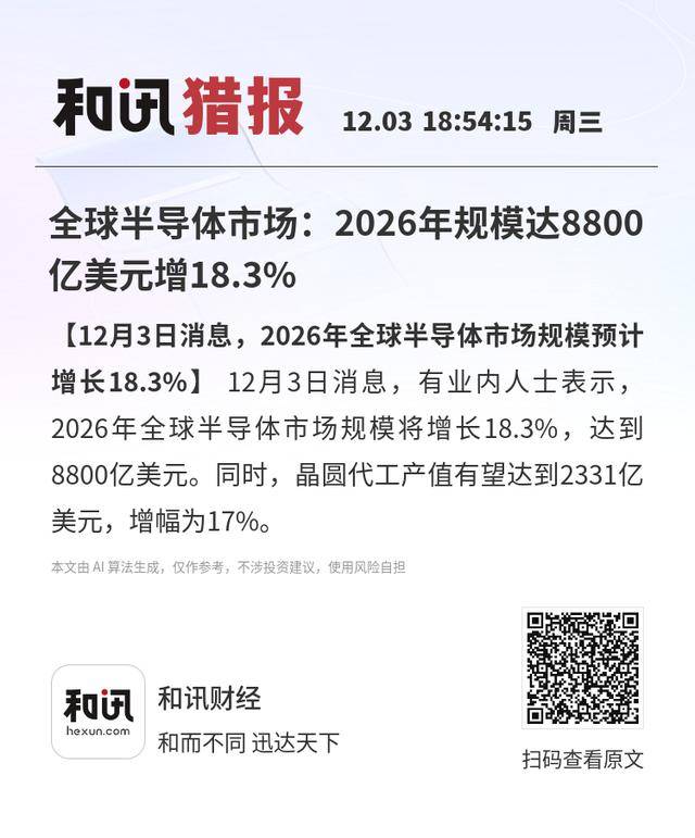 【12月3日消息,2026年全球半导体市场规模预计增长18.3%】12月3日消息,有业内人士表示,2026年全球半导体市场规模将增长18.3%,达到8800亿美元。同时,晶圆代工产值有望达到2331亿美元,增幅为17%。
