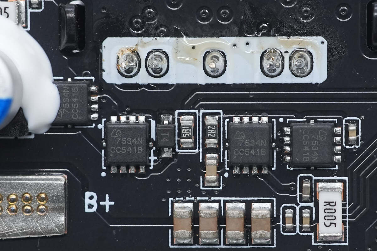 电池与主板间通过镍片与PCB板点焊连接。连接点盘白色灌胶处是热敏电阻的连接点,热敏电阻探头延伸到两块电芯之间,用高温绝缘胶带固定,用以检测电池温度。