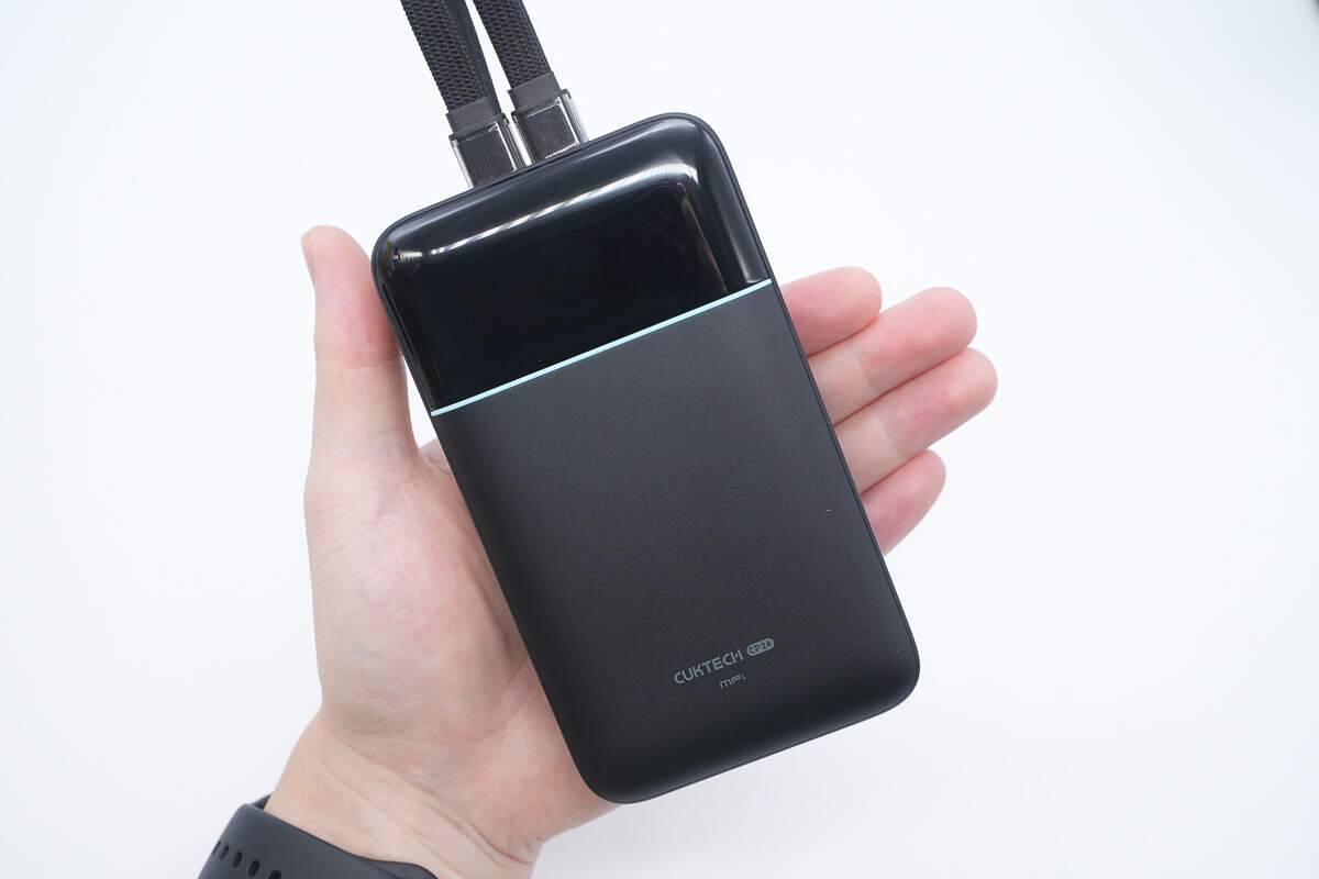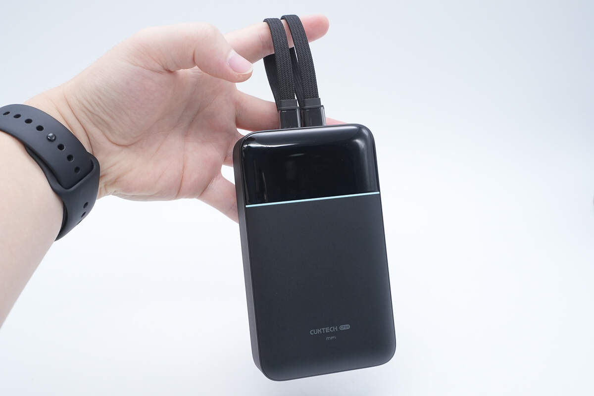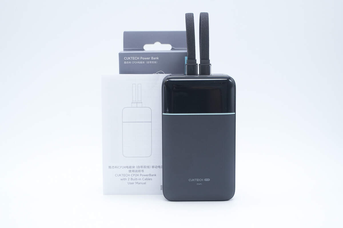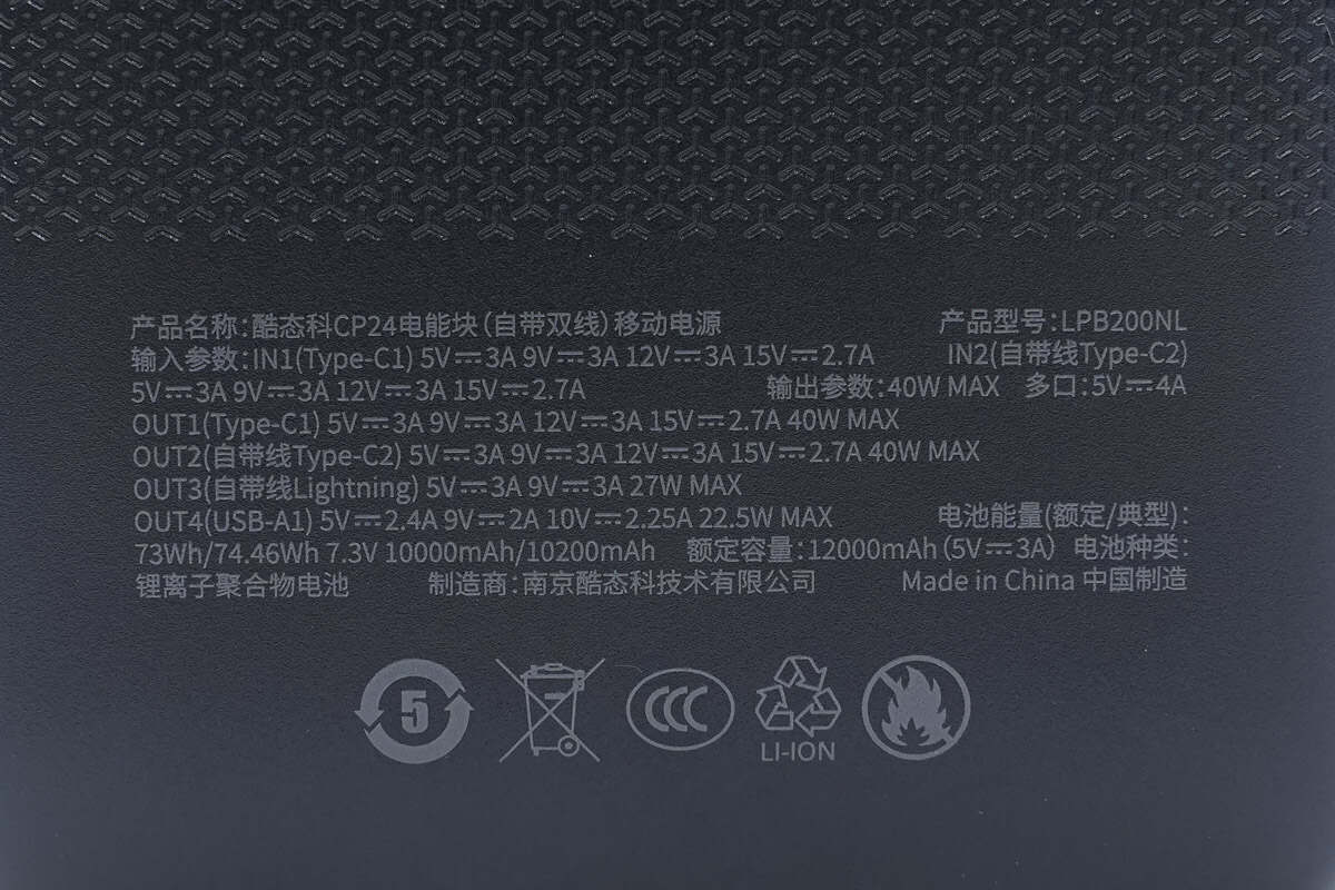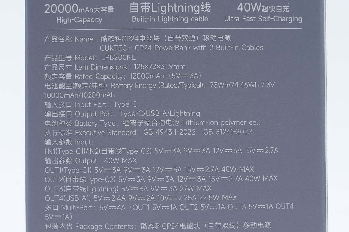 酷态科CP24电能块容量为20000mAh。搭载一根USB-C自带线和一根Lightning线,并配备1A1C两个USB接口,其中Lightning线通过了苹果MFi认证。输出方面单口支持 40W 双向快充,Lightning自带线最高支持27W输出功率,苹果安卓通吃。机身还配备数显屏幕可显示剩余电量信息以及充电功率。