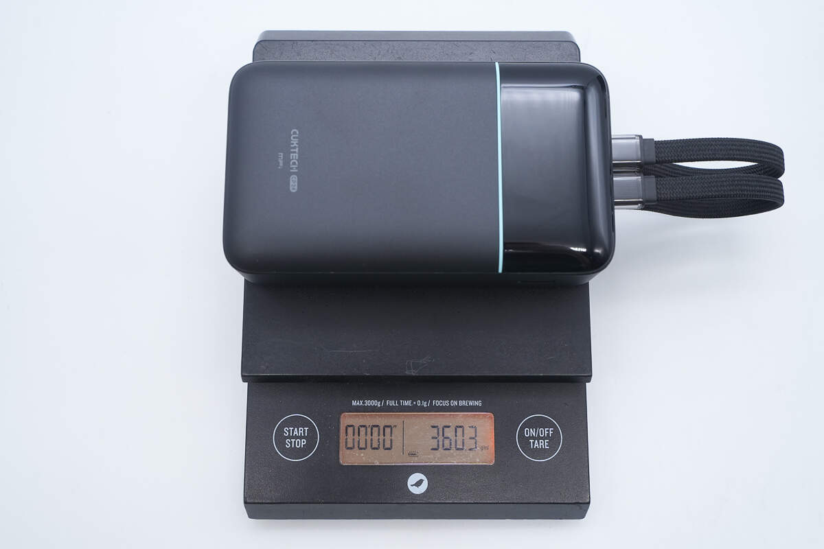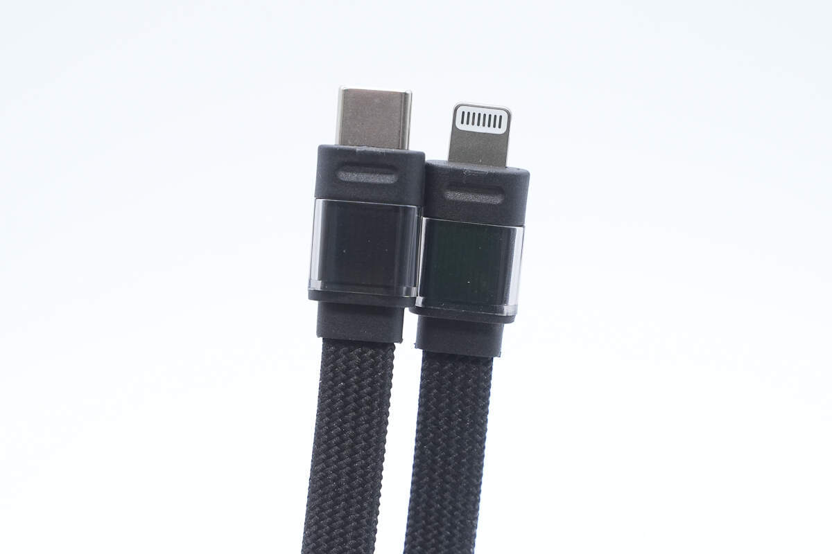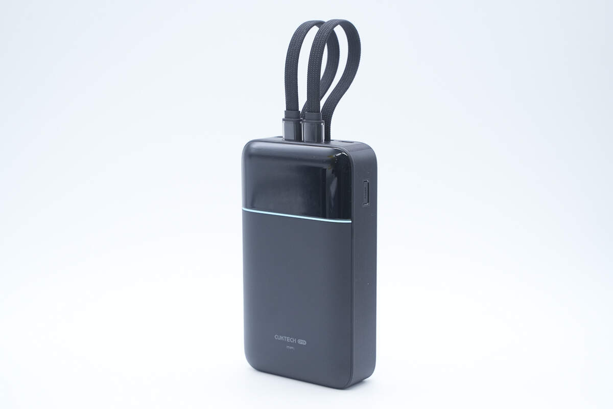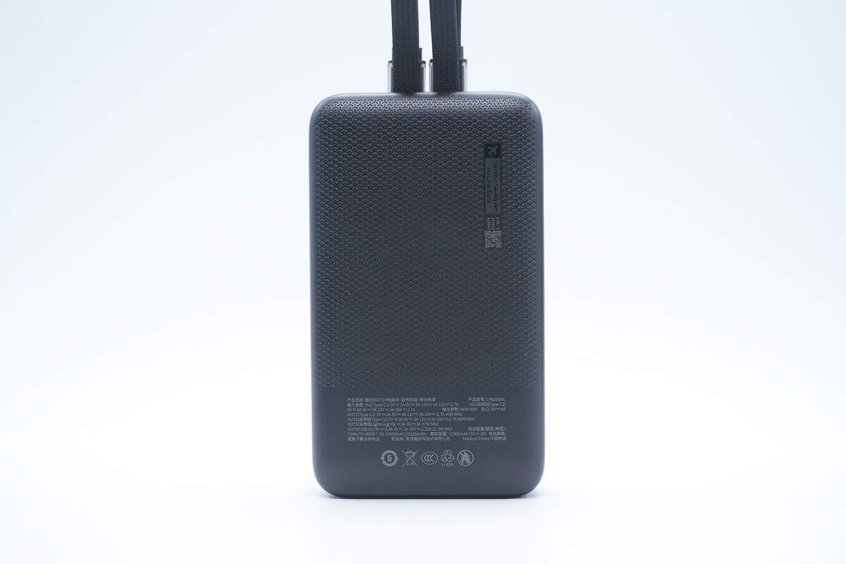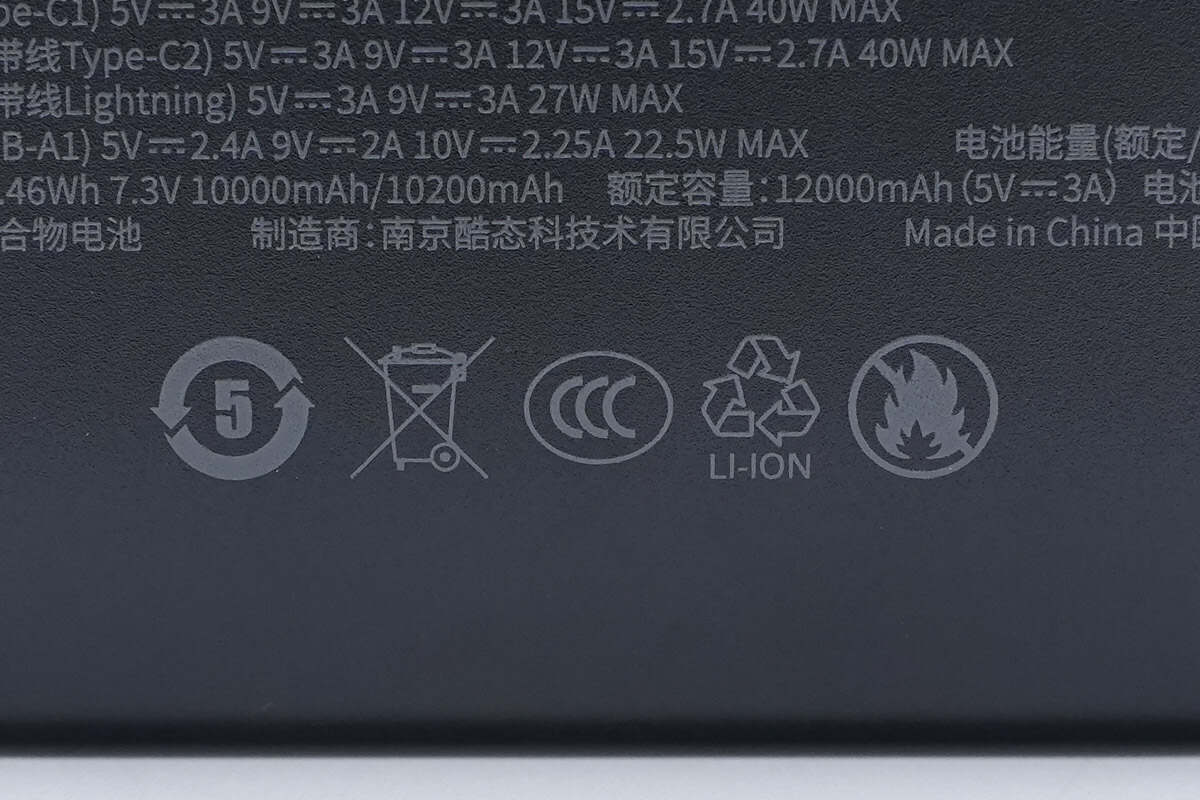 酷态科CP24电能块容量为20000mAh。搭载一根USB-C自带线和一根Lightning线,并配备1A1C两个USB接口,其中Lightning线通过了苹果MFi认证。输出方面单口支持 40W 双向快充,Lightning自带线最高支持27W输出功率,苹果安卓通吃。机身还配备数显屏幕可显示剩余电量信息以及充电功率。