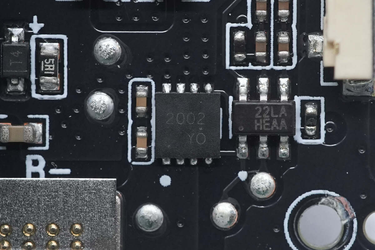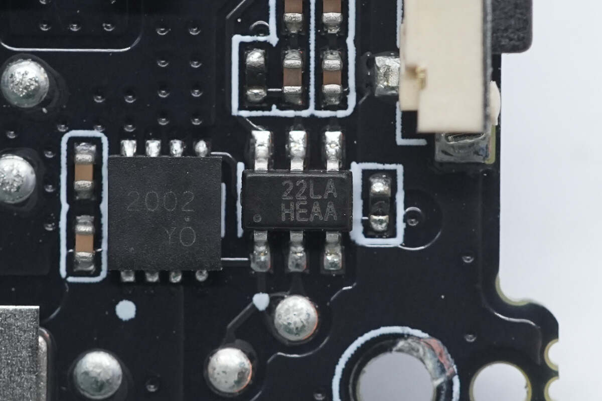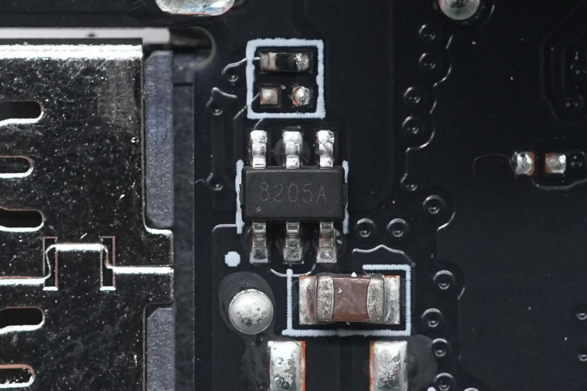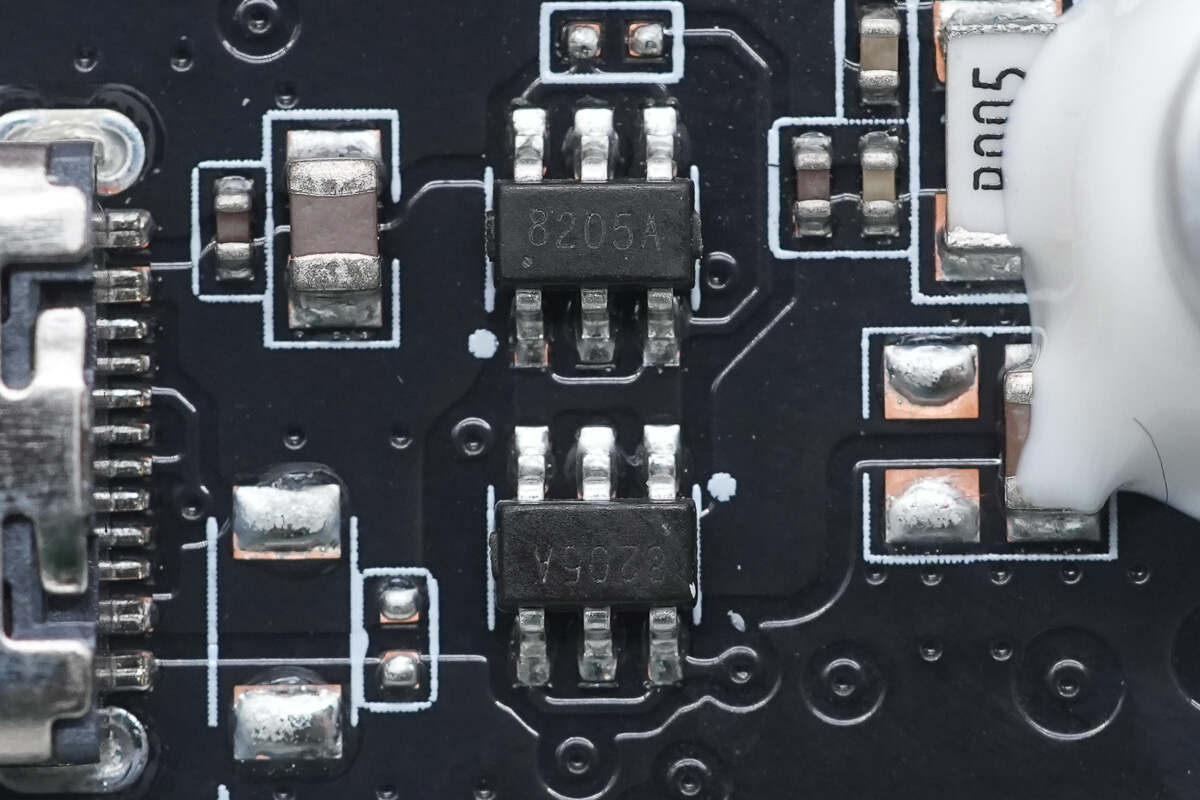 用于两根自带线的VBUS开关管特写,下面两颗对向串联,用于USB-C线,上面一颗用于Lightning 线,料号均一致,丝印8205A。