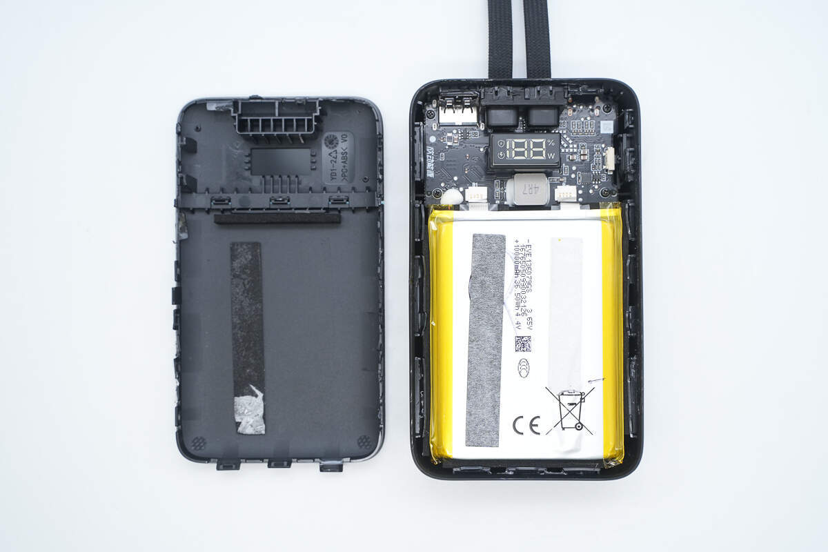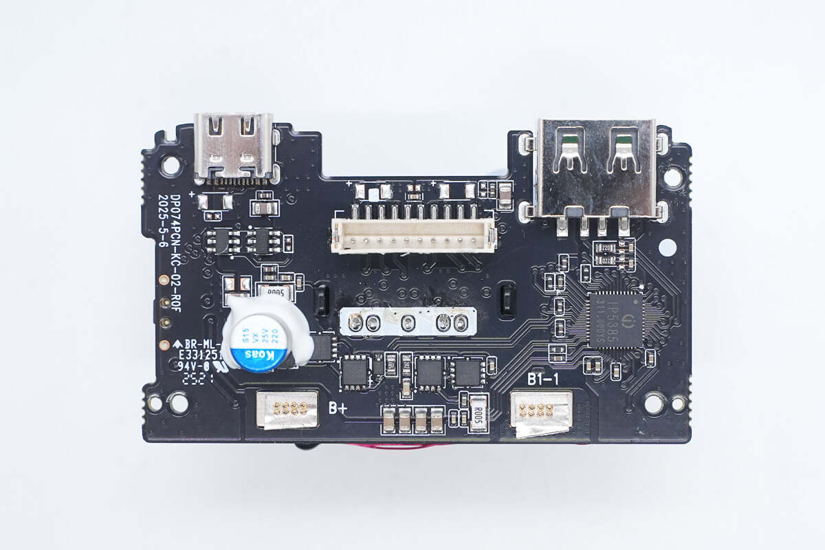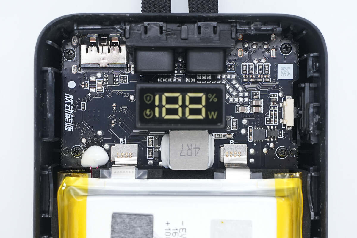 移动电源管理方案采用的是英集芯IP5385,这是一款支持2A3C1L多接口,集成UFCS、PD3.0等多种主流快充协议和多种功能的移动电源SOC芯片。电源内部电池组和PCBA模块周边贴缓冲泡棉缓震保护,并采用热敏电阻分别监测电池组温度。其内部结构稳定可靠,空间利用紧凑合理。