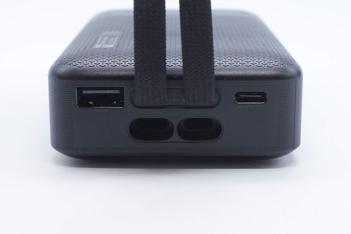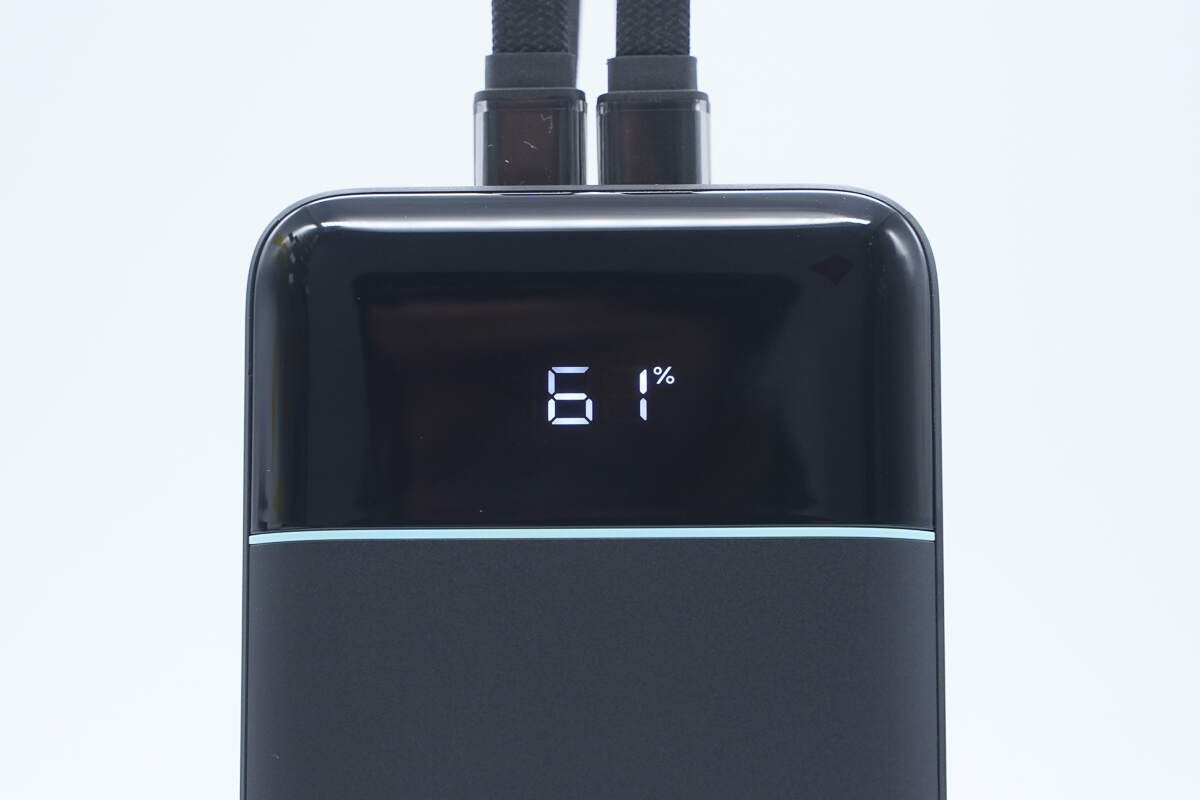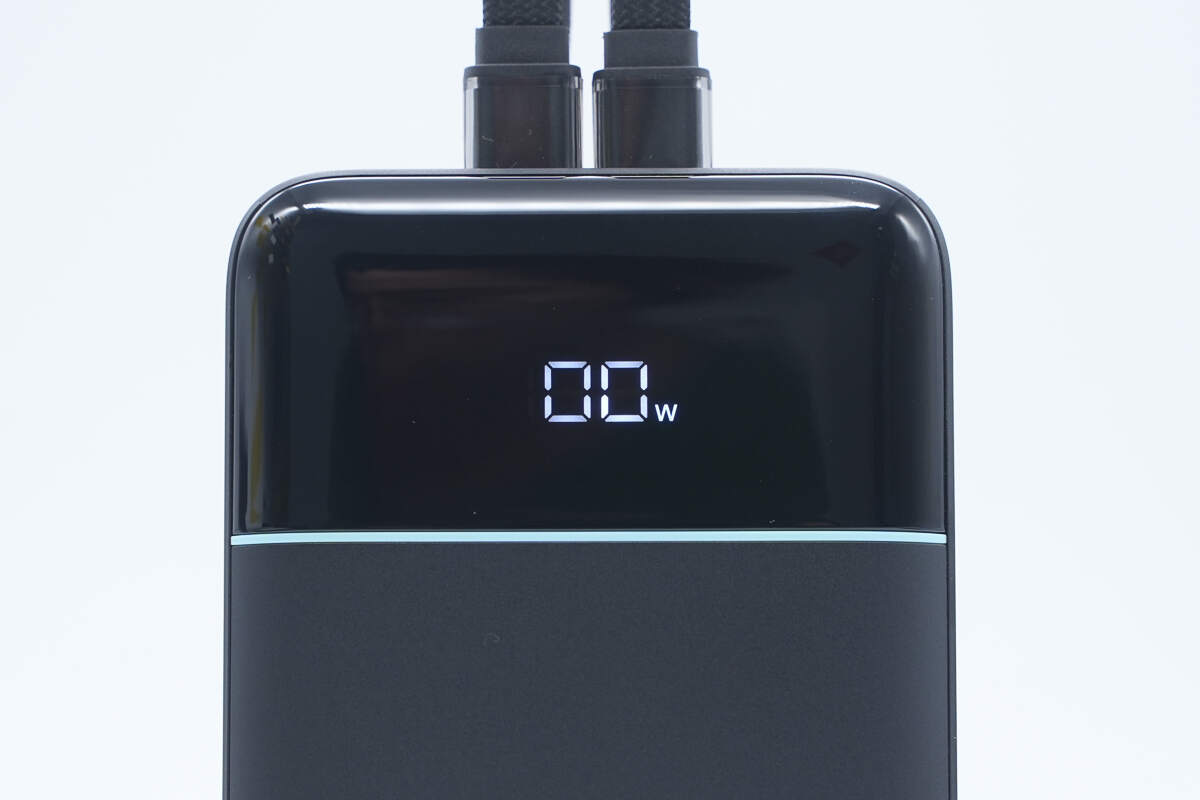 机身正面上方是黑色亮面装饰板设计,在按下侧边电源键后会显示充电宝剩余电量。