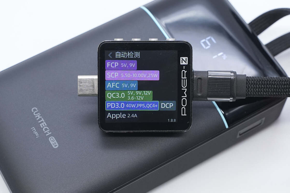 测得USB-C接口支持PD3.0、FCP、SCP、AFC、QC4+/3.0、PPS、DCP、Apple 2.4A充电协议。