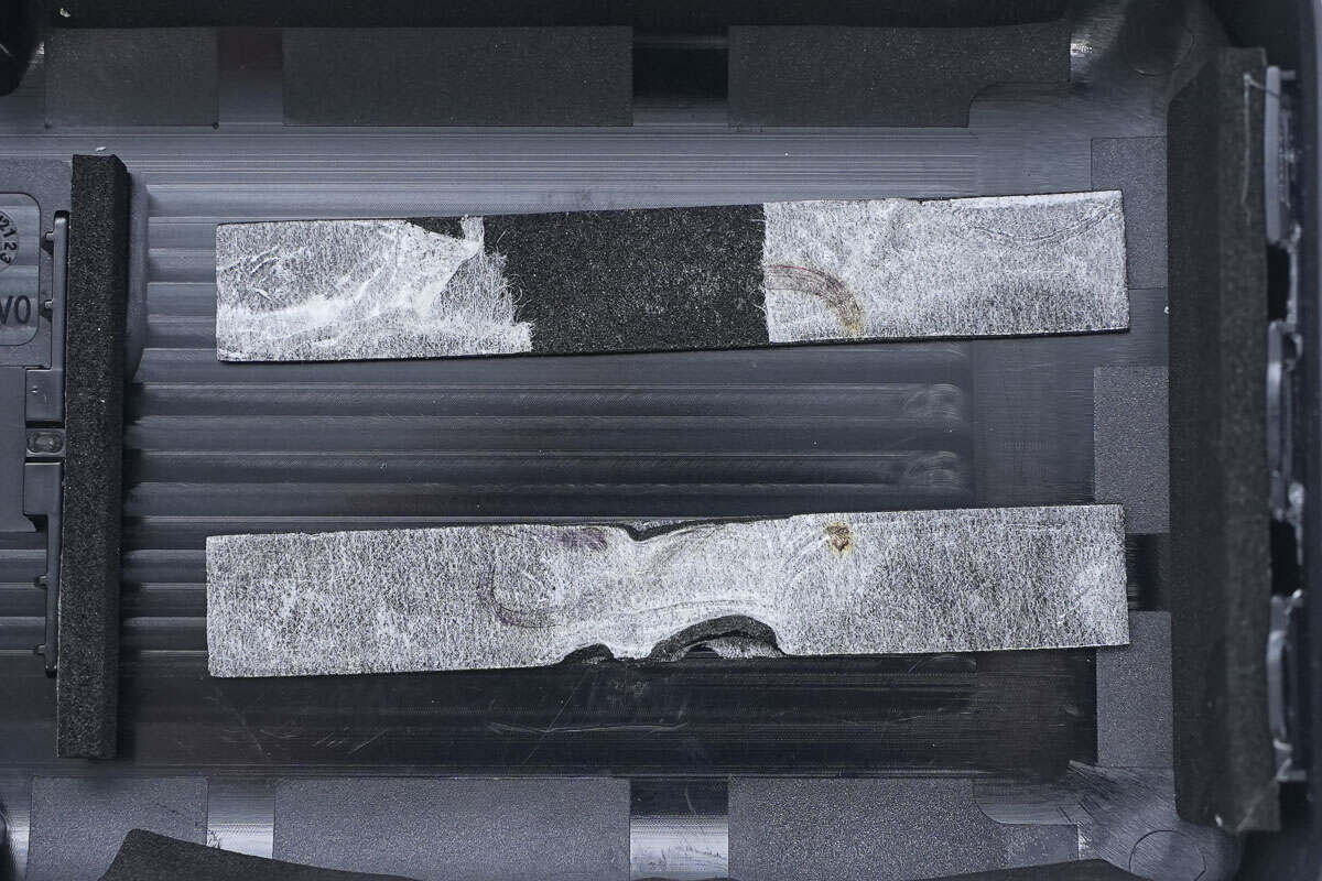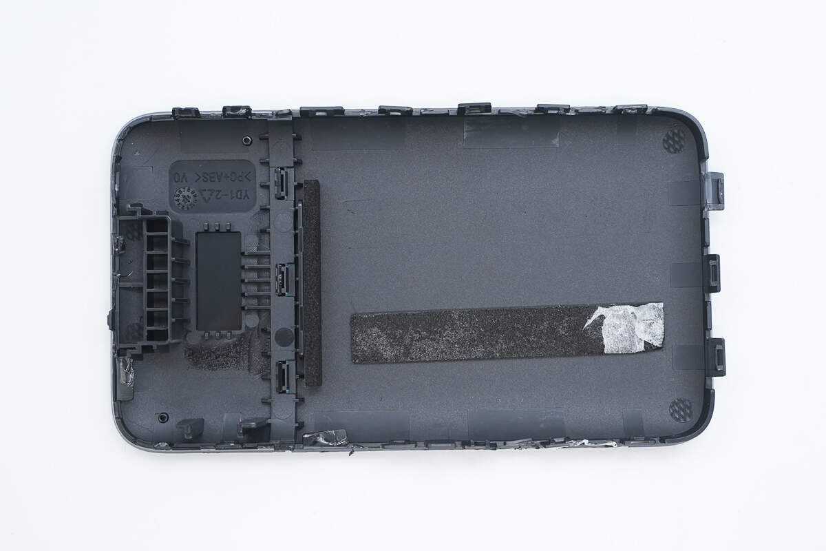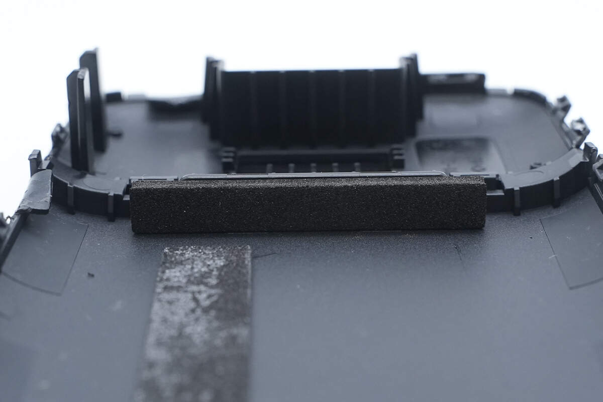 先看底壳,底壳四周都有缓冲泡棉固定电池,用来缓冲抗震,底面还设有两根长条泡棉用于电池与外壳间填缝与限位。