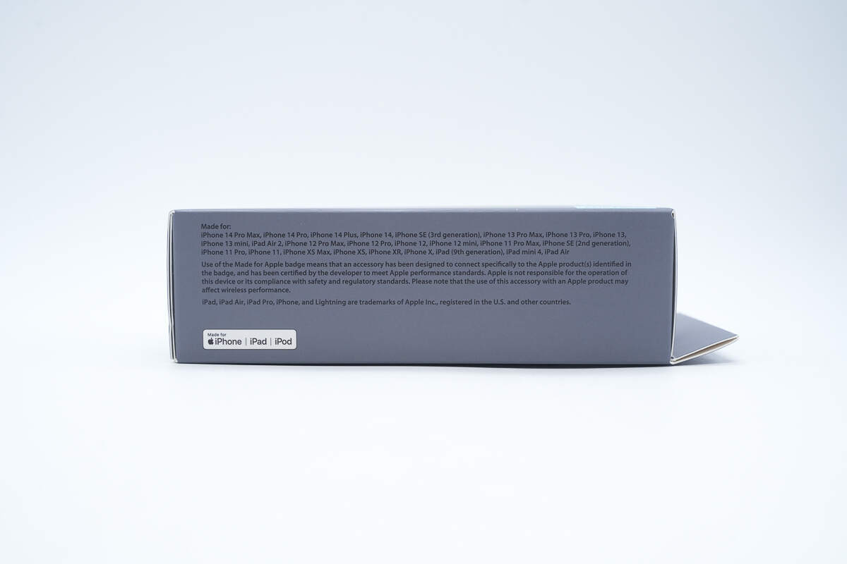 在包装盒的侧面还印有兼容机型清单与“MFi”徽标,进一步说明这款产品已通过苹果认证、按苹果性能与安全规范设计。