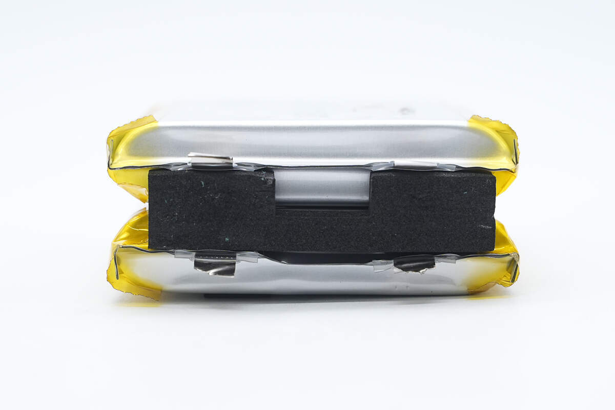 正面板横向泡棉垫用于给电芯缓冲抗震,下面长条泡棉与胶带组合固定,用于电池与外壳间填缝与限位。