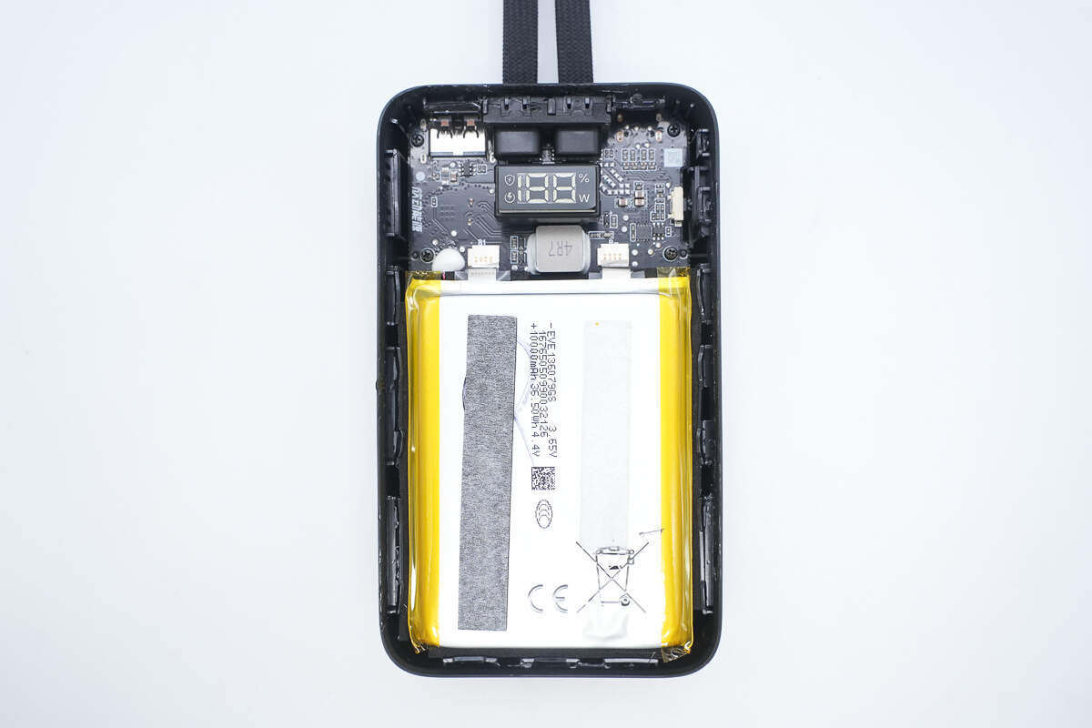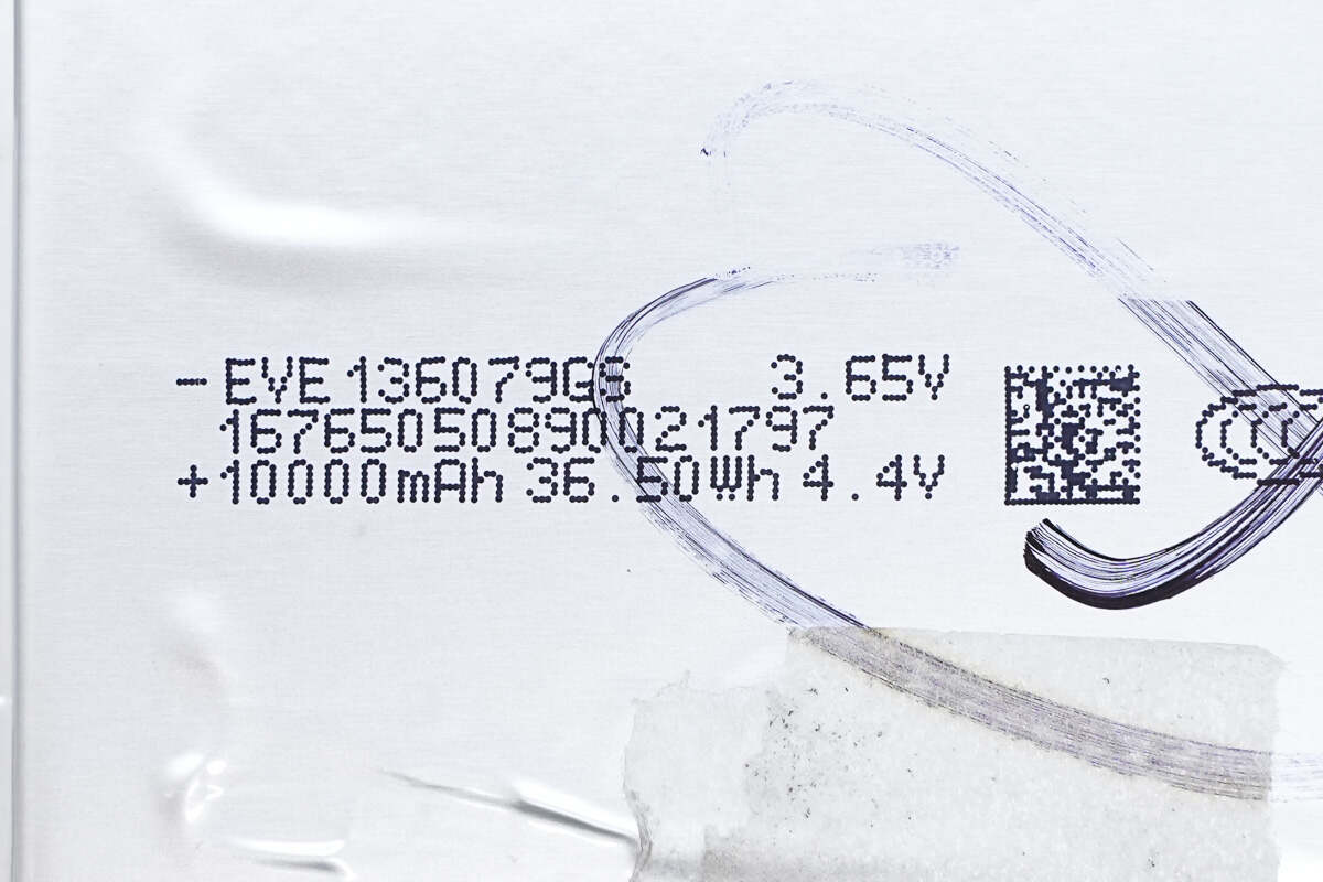 两块电芯料号相同,均来自EVE亿纬锂能,型号136079GS,标称电压3.65V,单块容量为10000mAh,能量36.5Wh,充电限制电压4.4V,并且通过了国家CCC强制认证。