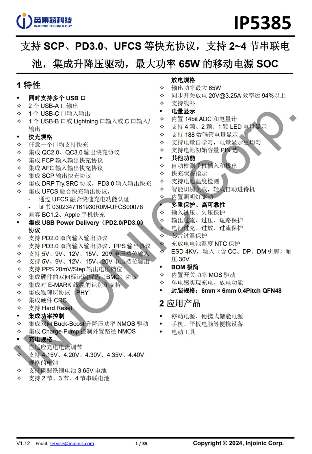 IP5385支持2~4节串联电池,同步开关升降压系统可提供最大65W的输入输出功率,轻载时自动进入休眠状态,采用QFN48封装。