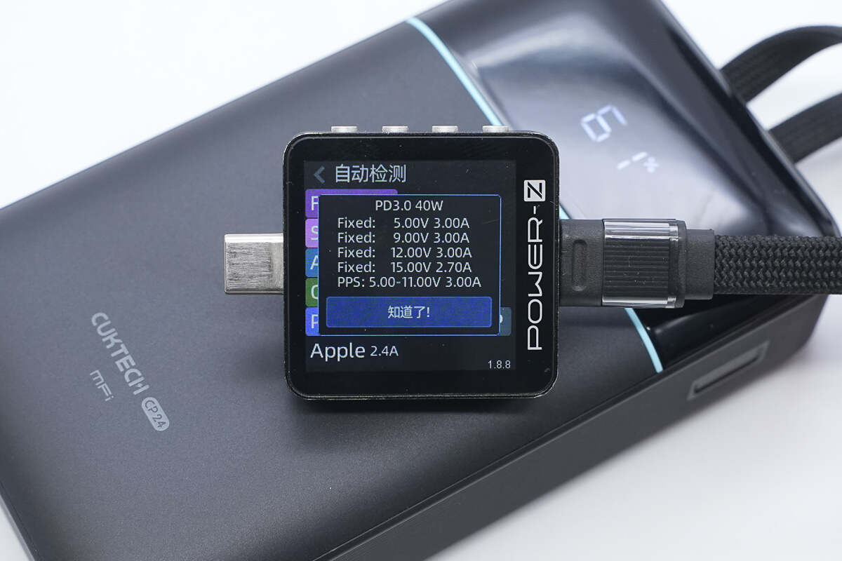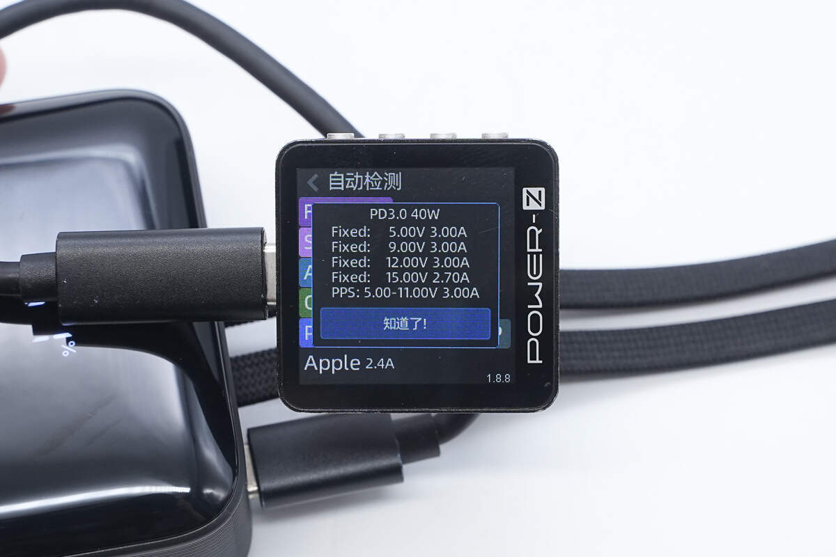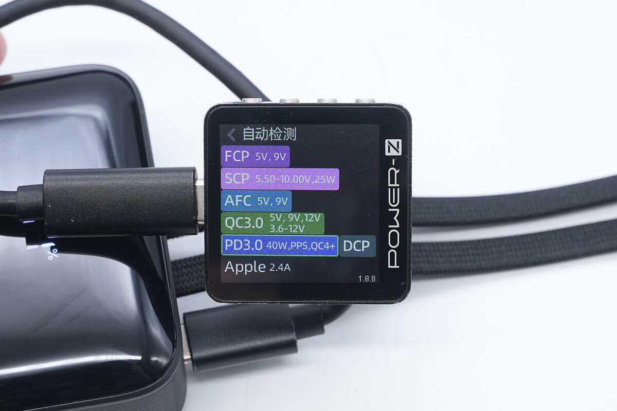 测得USB-C自带线支持PD3.0、FCP、SCP、AFC、QC4+/3.0、PPS、DCP、Apple 2.4A充电协议。