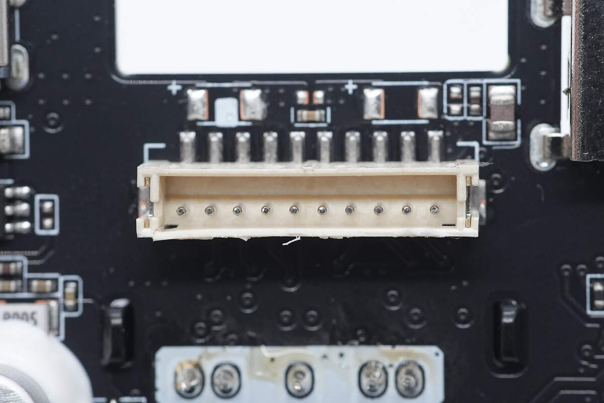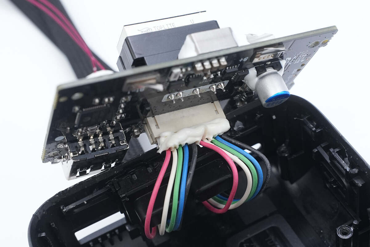 两条自带线通过排线座连接主板,接口处灌胶固定。