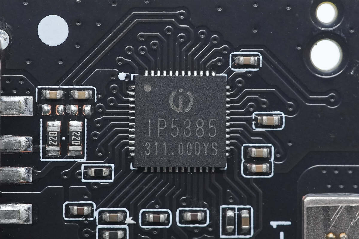 充电宝主控芯片来自英集芯,型号IP5385,这是一款超高集成度的快充移动电源SOC芯片,支持PD3.0、PPS、AFC、FCP等主流快充协议,并集成同步双向升降压驱动、锂电池充电管理、电池电量指示等多功能,可为快充移动电源提供完整的电源解决方案。