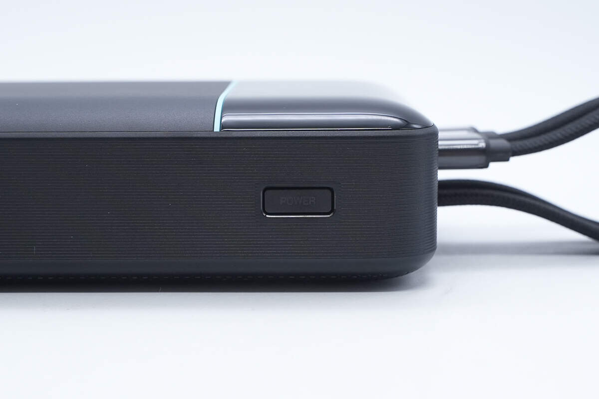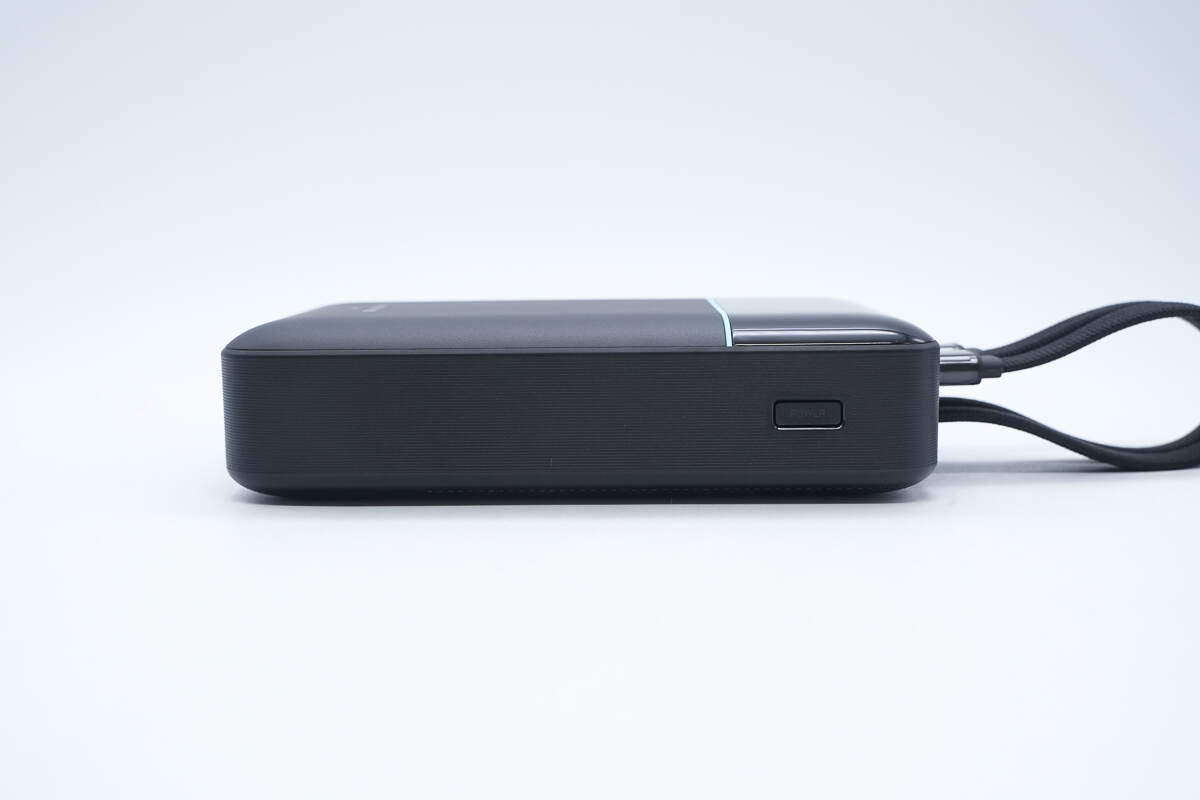 酷态科CP24电能块整机为圆角长方形的黑色机身,顶部做了亮面与机身中腰分隔线的两段式设计,正面仅留“CUKTECH CP24”字样,显示产品品牌与型号。侧边有一枚电源键,用于点亮数显屏幕显示充电宝剩余电量与充电功率。