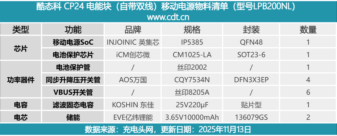 最后附上酷态科CP24电能块的核心器件物料清单,方便大家查阅。