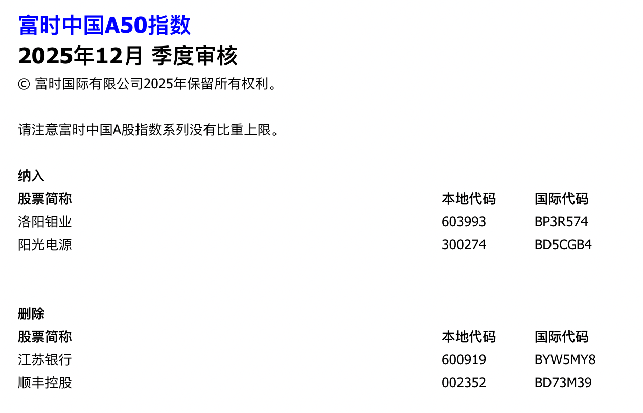 12月3日,富时罗素公布2025年6月富时中国50指数、富时中国A50指数、富时中国A150指数、富时中国A200指数以及富时中国A400指数季检结果,该变更将于12月19日星期五收盘后生效。